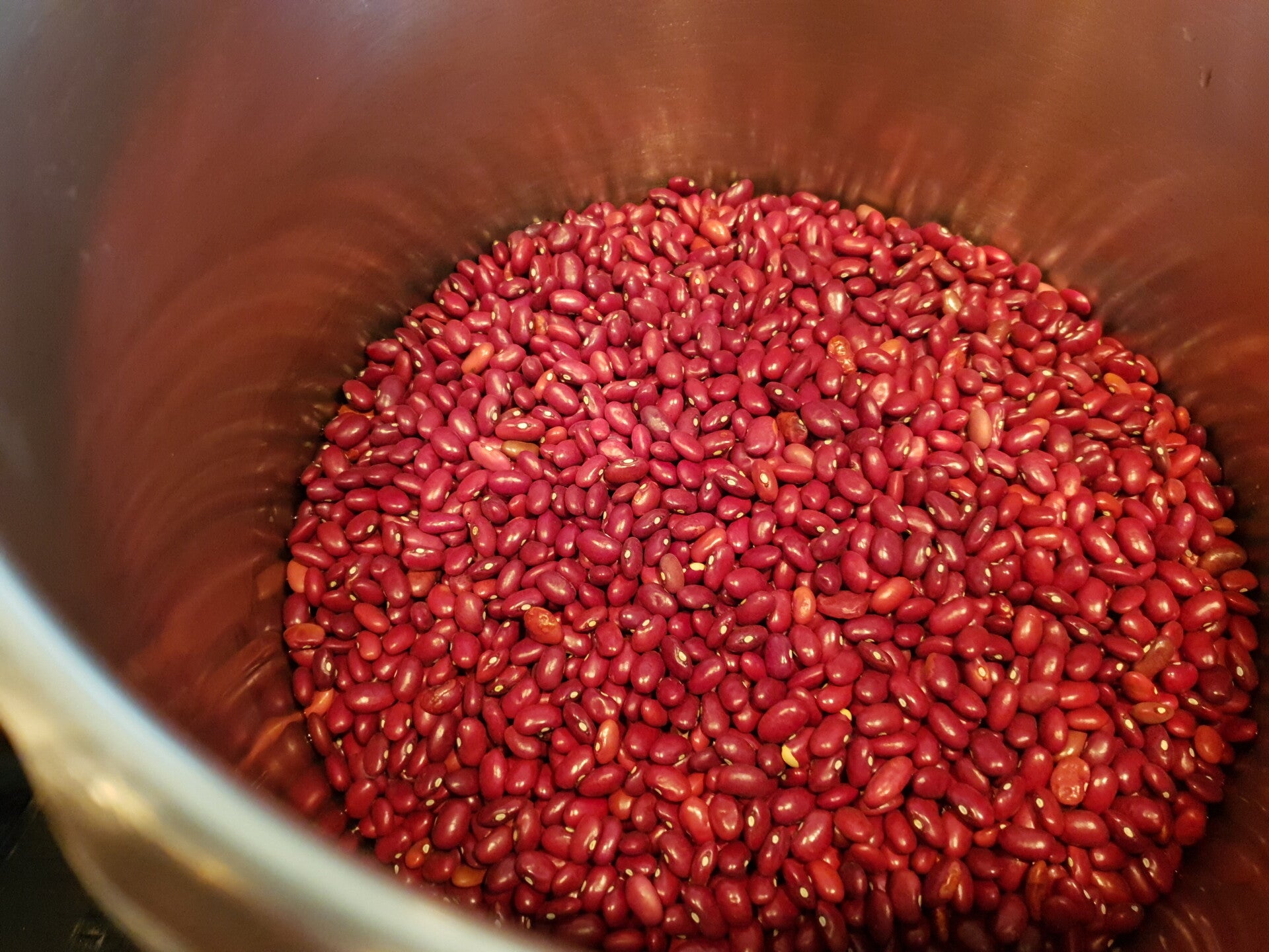 - Die ungekochten Bohnen in einem Schnellkochtopf mit Wasser bedecken, salzen und für ca. 40 Min kochen (ca. 2 Durchgänge des Dampfmaximum)