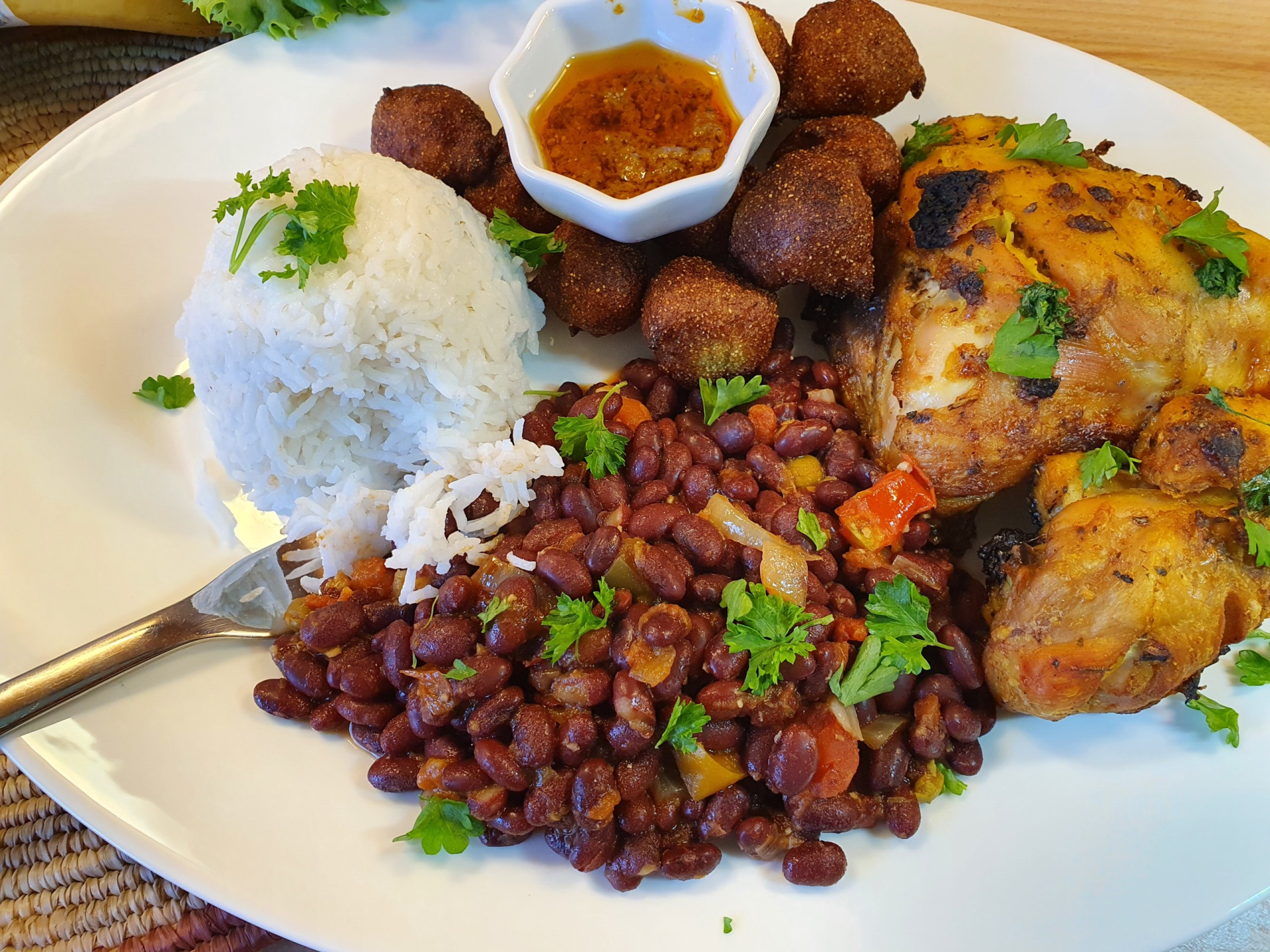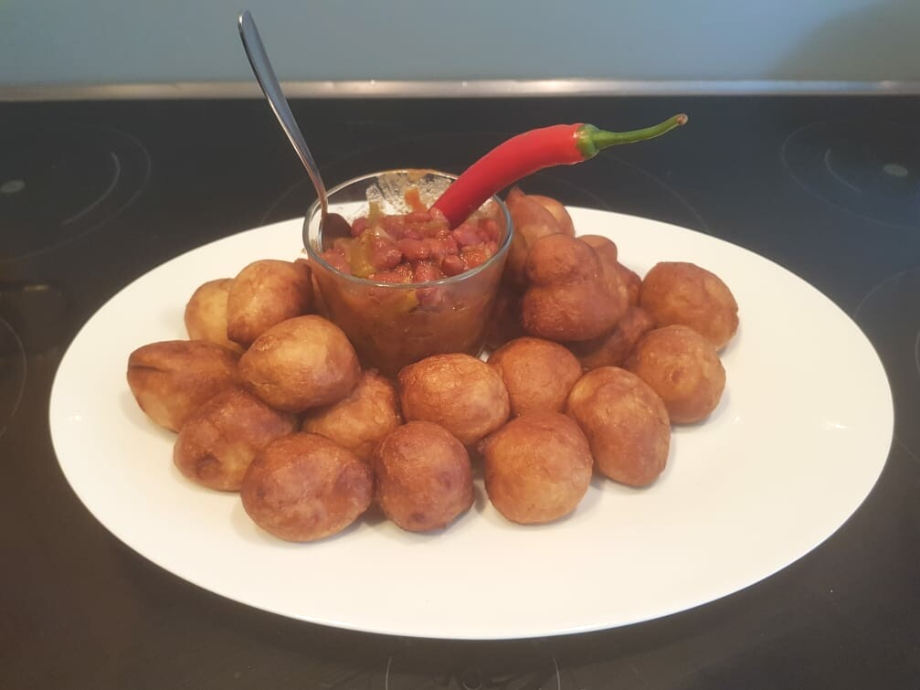 Seit ich in Deutschland lebe habe ich ein anderes Trio für mich entdeckt und es heißt BHP (Beignets-Haricots-Poulet🍗), also habe ich die Maisbrei durch "Gemüse" ersetzt, in dem Fall Hähnchen 😉