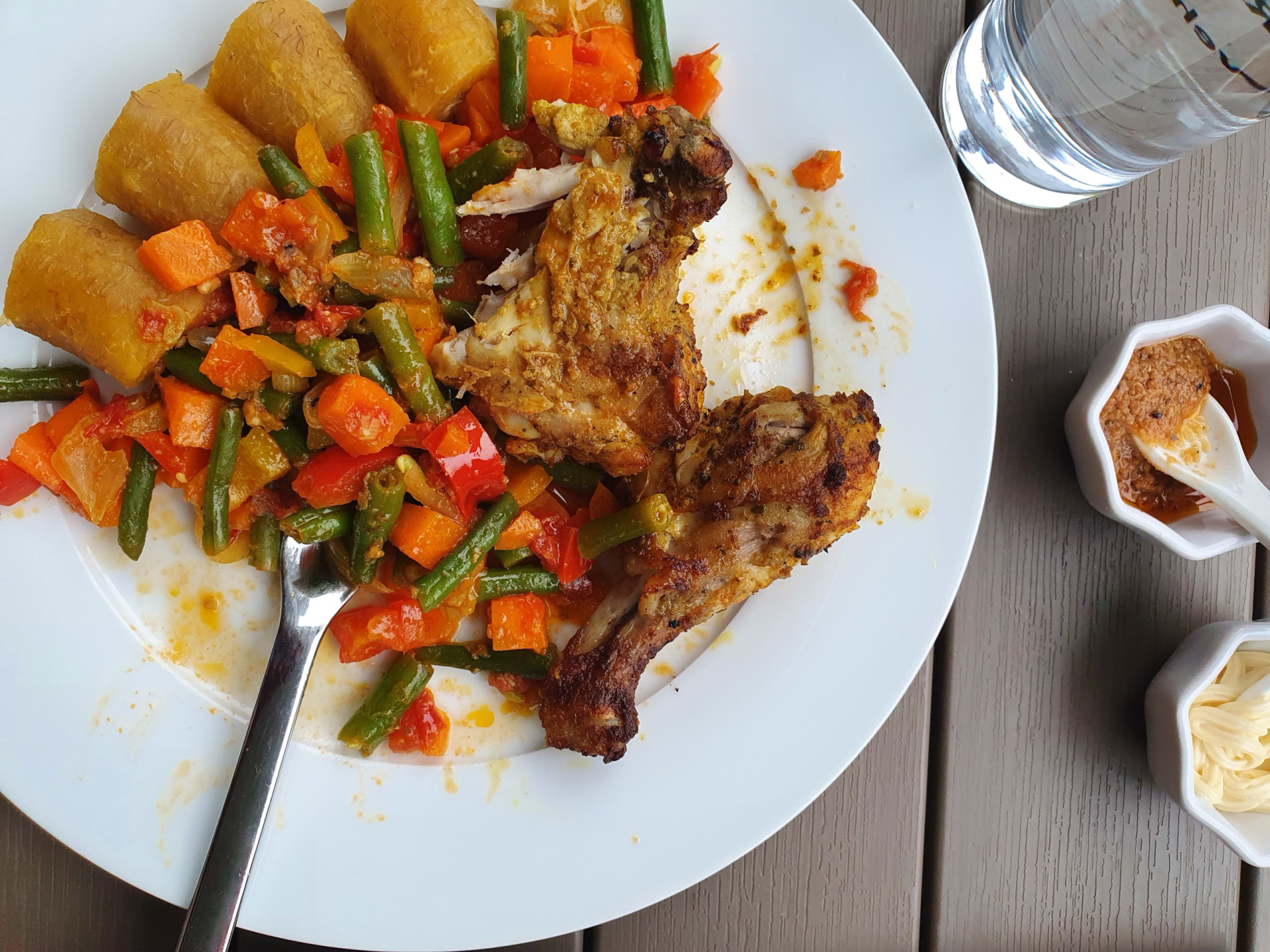 Mit Reis und Evtl. gegrillte oder gebackenes Hähnchen und Kochbananen oder Reis servieren.