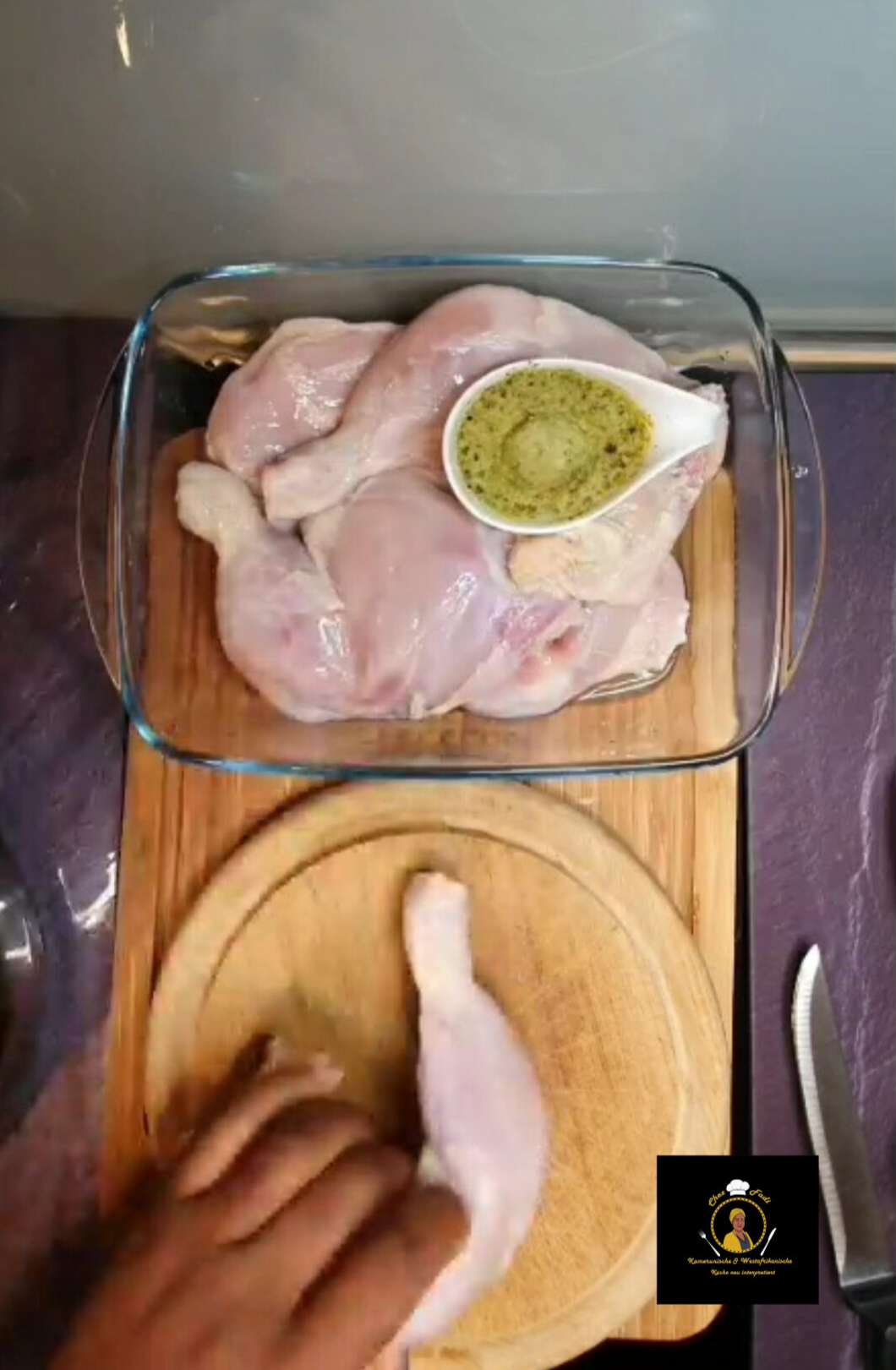 - Dann die Hähnchenschenkel in 2-3 Stücke schneiden und Einschnitten in das Fleisch machen