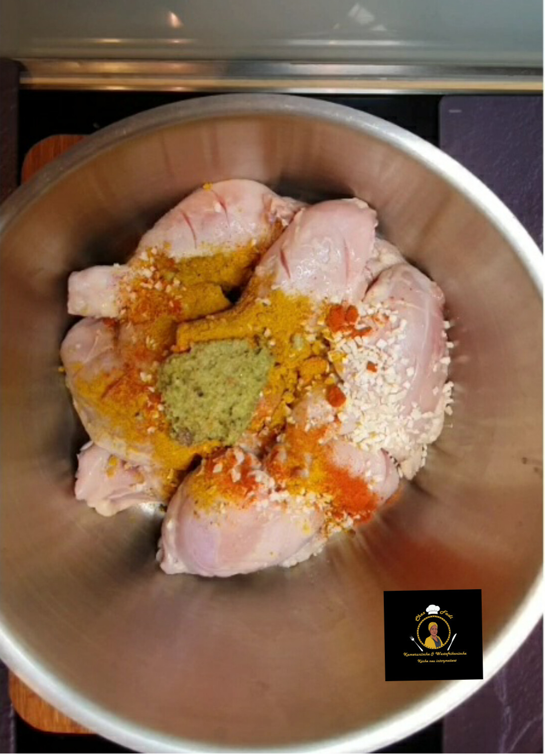 - Das Ganze in einem Topf geben mit Speiseöl, Salz, Zwiebelpulver, Paprikapulver, Curry, Magic Sauce, Senf und Liebstöckel gut vermischen Chilischote hineingeben und zugedeckt mindesten 30 Minuten ziehen lassen