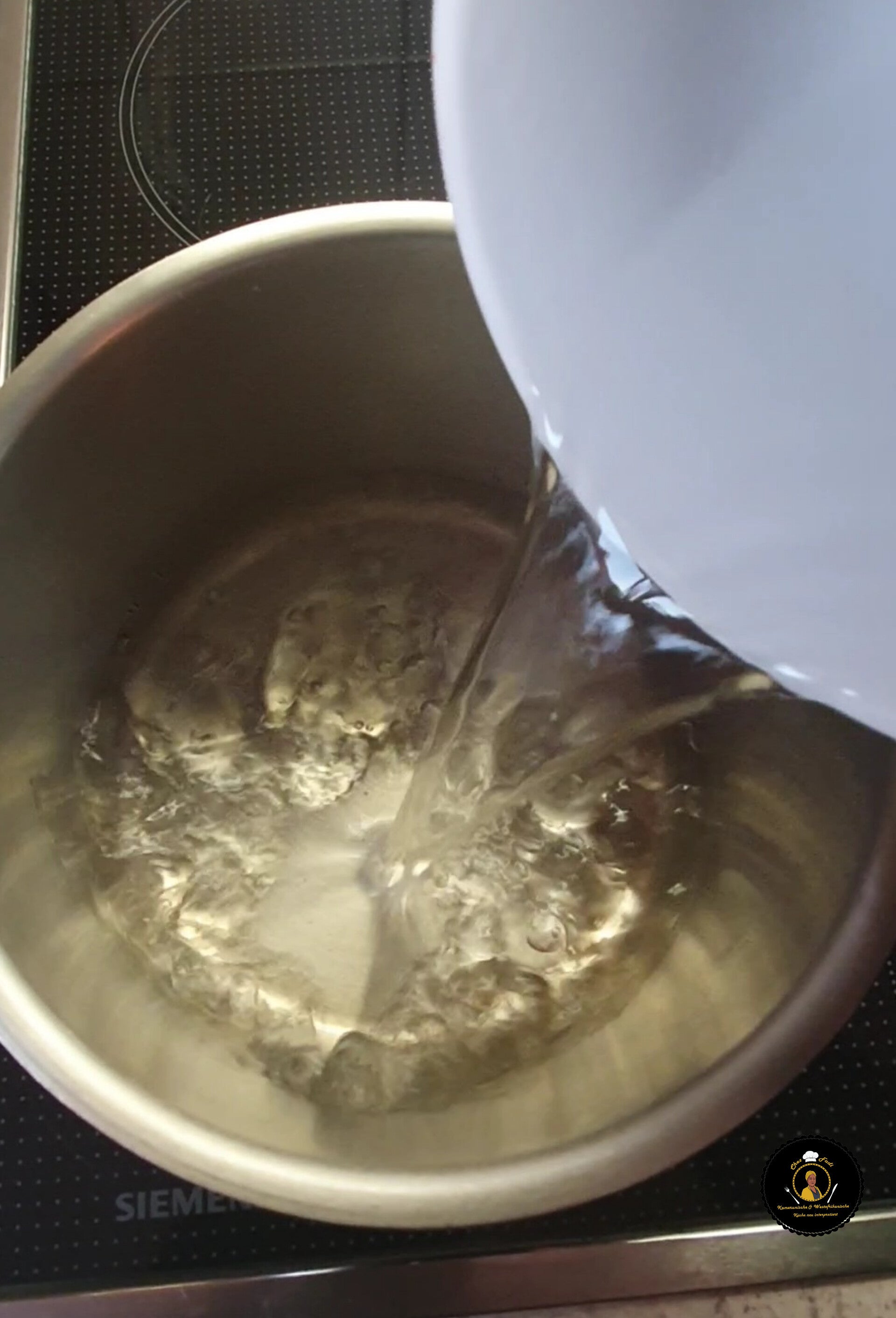 Ca. 150 ml Wasser in einem Topf geben und erhitzen (nicht kochend heiß)