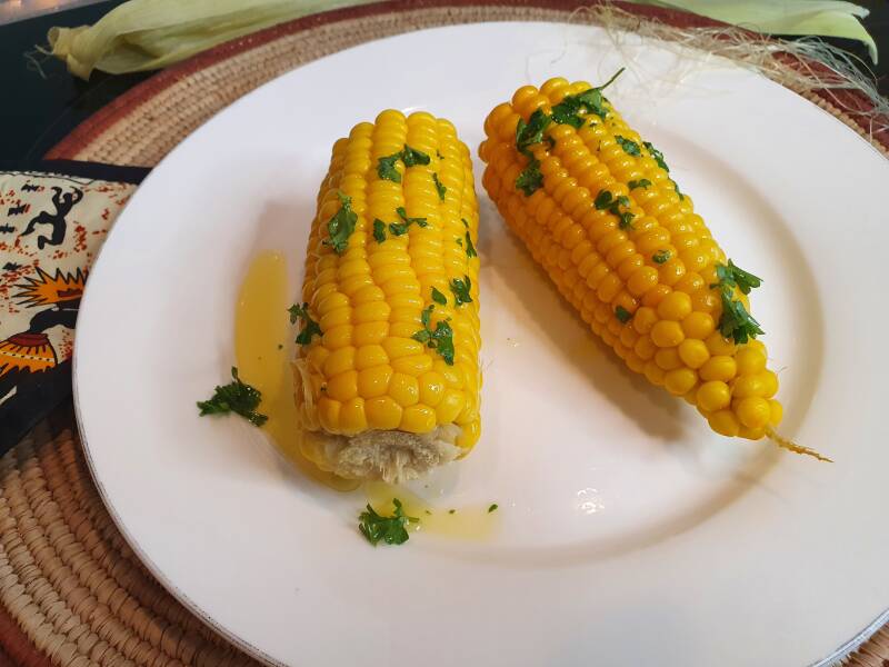 - Die Fertige Maiskolben auf einem Teller legen und die geschmolzenen Butter oder Ghee drüber verteilen