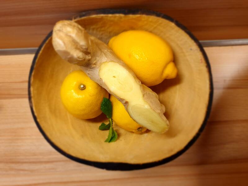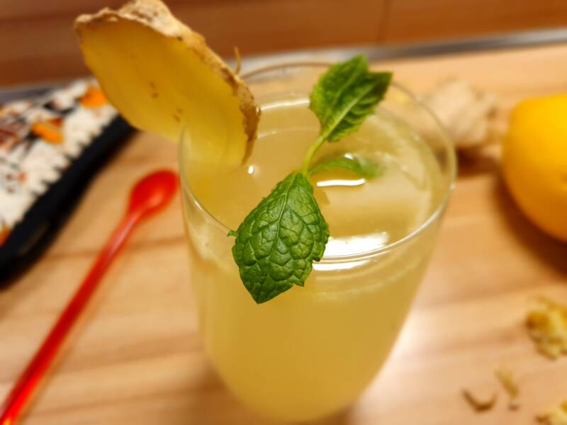 - Ingwer gut waschen, in Stücke schneiden (optional vorher schälen) und in einem Mixer mit dem Wasser pürieren.