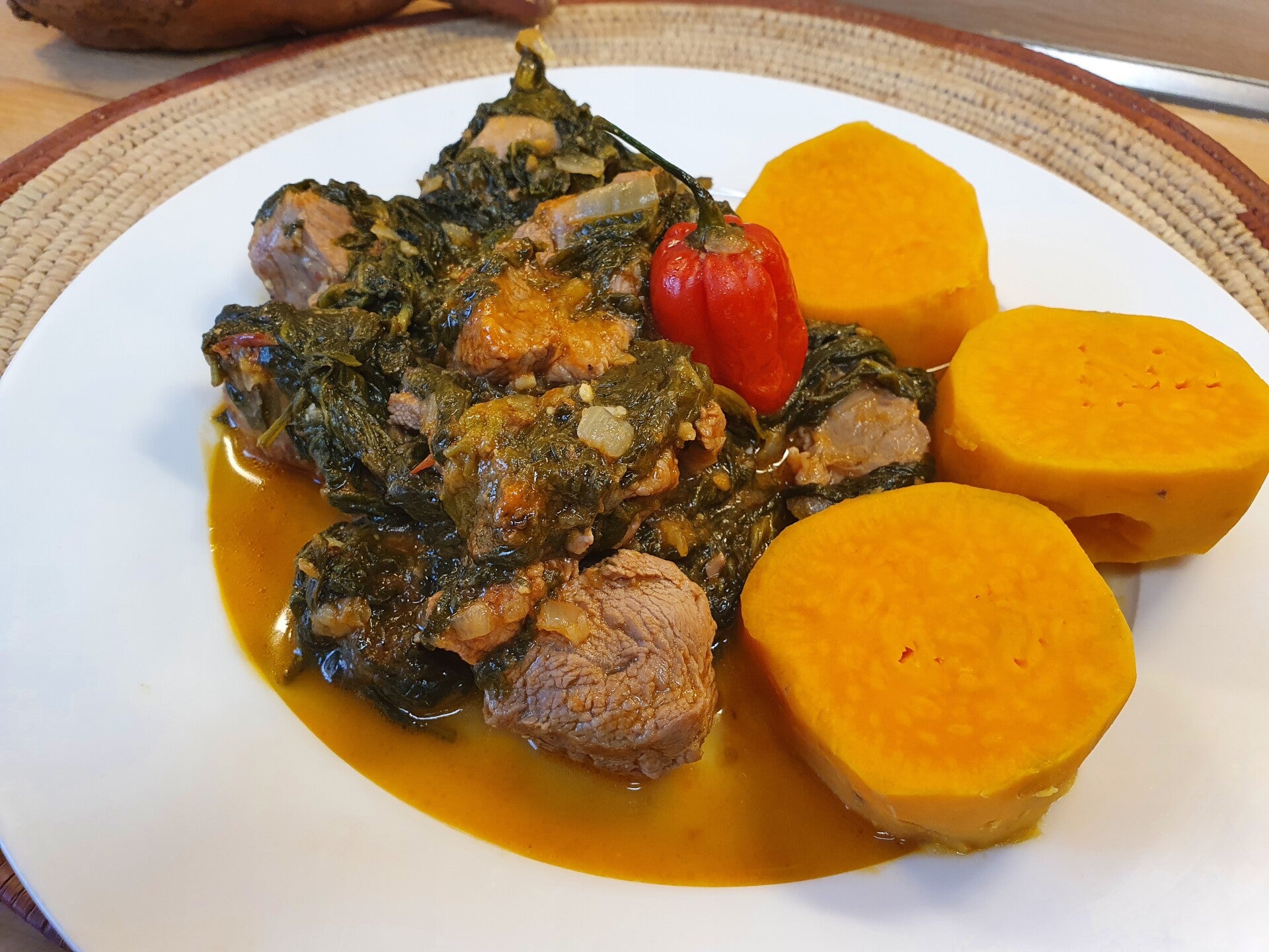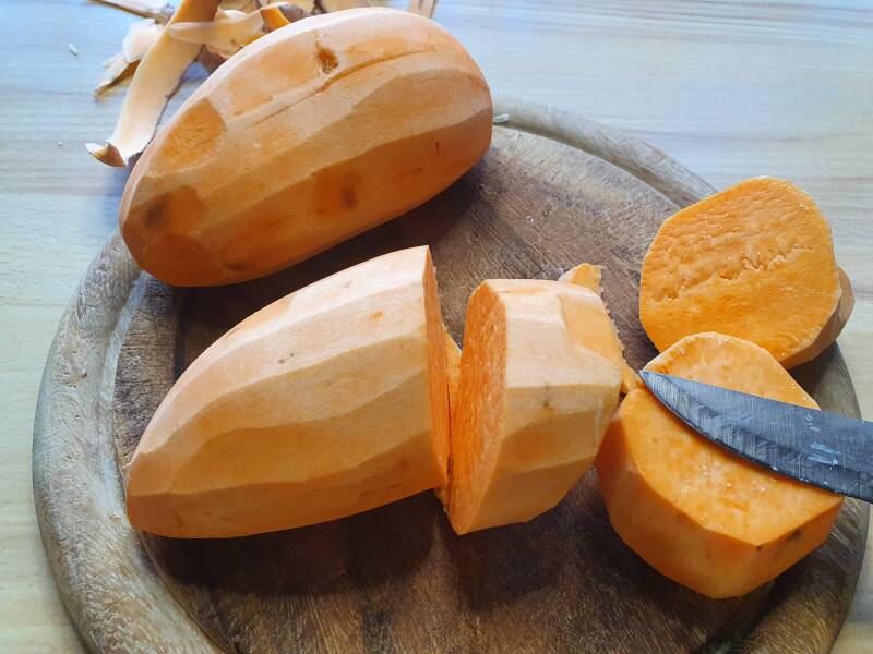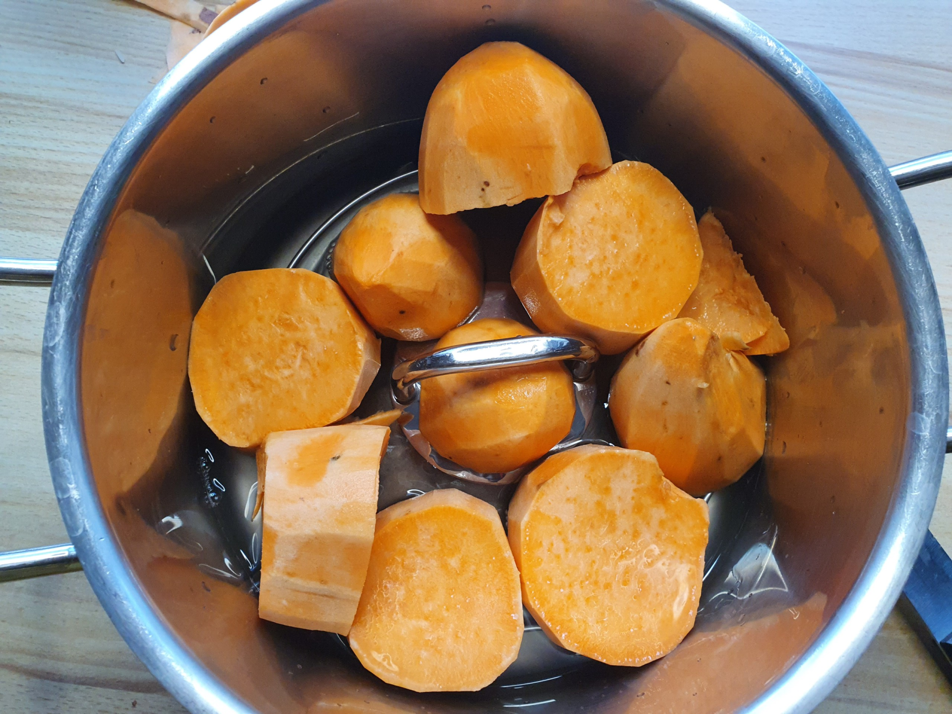 - In der Zwischenzeit die Süßkartoffeln schälen, in Stücke schneiden und in einem Topf mit dem Wasser für ca. 15 Minuten unter ständigem Beobachten garen. Nach Wunsch mit etwas Salz bestreuen